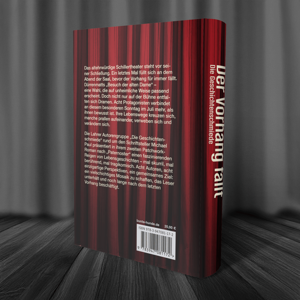I teamed up again with Michael Paul and his writers‘ group to work on the cover design for their latest patchwork novel, Der Vorhang fällt. The design draws inspiration from their previous novel, Paternoster, maintaining the same wooden tones and diagonal patterns, complemented by a red curtain to evoke a theatrical atmosphere. The book will be available soon in his online shop bunte-hunde.de and at local bookstores in the Black Forest region.